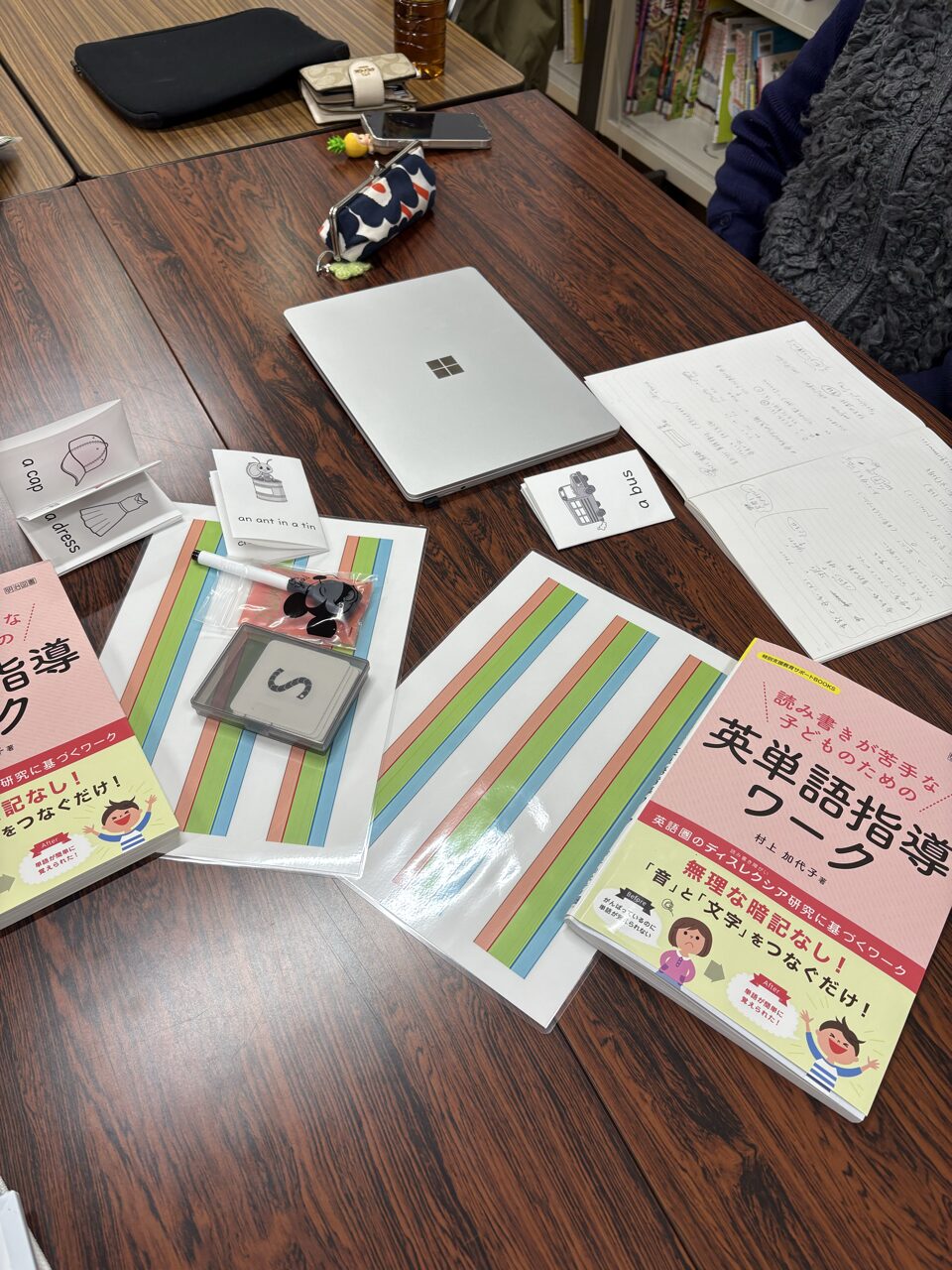 また、文字が持つ音がわかっても、いきなり書くのではなく、今度は「聞こえた音のかたまり(=単語)を音素に分ける練習を踏んでから、文字に書き起こすというように、階段のように1つずつステップを踏む指導をします。