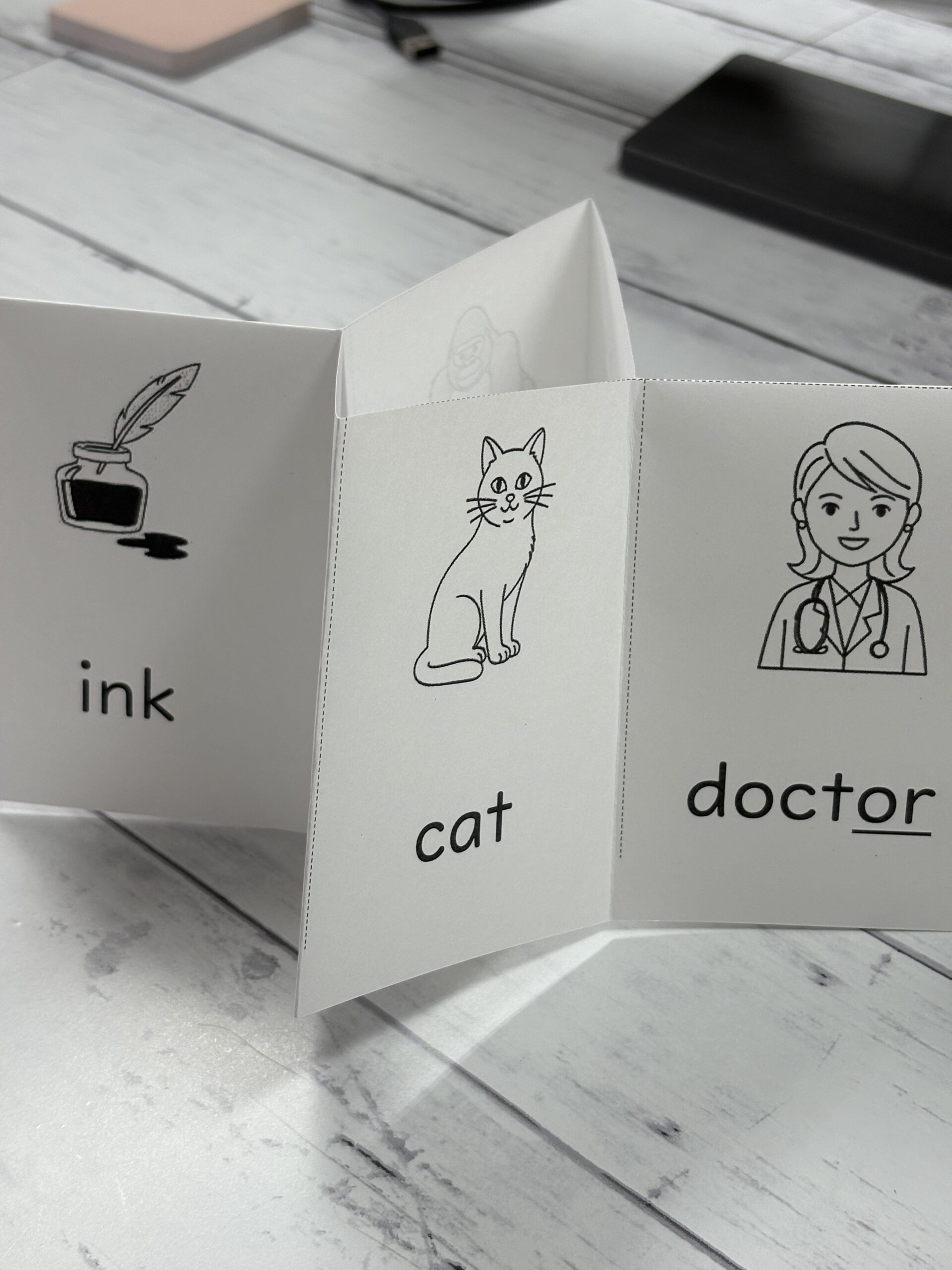 2文字で1音となる(ダイグラフ)ものは難しい上、ooは短い発音と、長い発音の2種類を持ちます。長さがわかるよう、はじめはoを縦長、横長と音に応じて表記を変えて表し、長さの違いを強調、視覚的にわかるように支援して指導します。また、日本語では子音単独で音を出すものは「ん」しかなく、「子音+母音」に慣れている私たちですから、子音に母音の音もくっつけて発音しがちです。子音だけで1音を表す感覚を身につけるため、日本語との違いを意識した音声指導を、口の形やのどの震え、舌の位置など、自分で見たり聞いたりさわったり、多感覚を使った指導をしていきます。